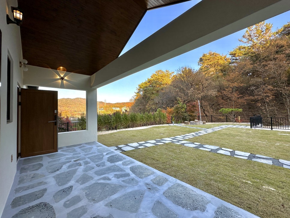 마당에는 아름다운 조경과 파이어플레이스, 고를 살린 삼각 포치가 돋보이는 작지만 예쁜 이상적인 전원주택으로 사랑받은 모델이다.